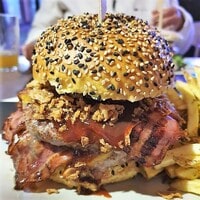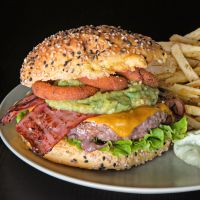 Queijo Cheddar, Bacon, Guacamole, Cebola Frita, Alface e Tomate.