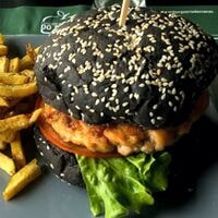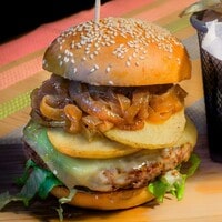 Hamburguer de Vegetais com 120gr., Queijo Vegan, Cebola Caramelizada, Alface e Tomate.