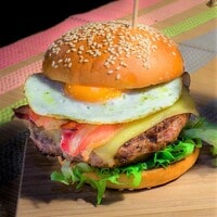 Queijo Cheddar, Bacon, Ovo Estrelado, Alface e Tomate.
